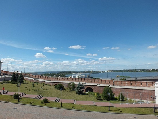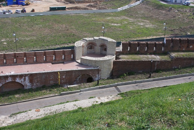 Мы видим практически ту же картину, которую ранее наблюдали в Петропавловской крепости и Ярославле. Стену откопали, сделали вдоль неё дорожку и подпорную стенку, чтобы оставшийся грунт не осыпался. На этом фото стоит обратить внимание на полукруглые ниши в стене, где сейчас организованы магазины сувениров, точнее на их размеры. А теперь посмотрим на фрагмент стены, где работы ещё не проводились.