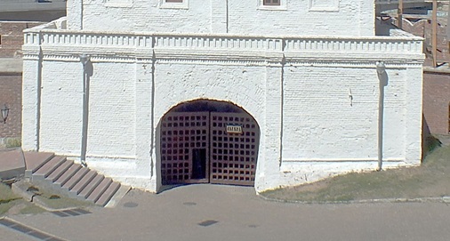 А теперь посмотрим на стены кремля. Несколько фотографий нижнего выезда через Тайницкую башню. На них хорошо видно, что проезд в ворота пришлось углубить относительно общего уровня рельефа больше чем на полтора метра.