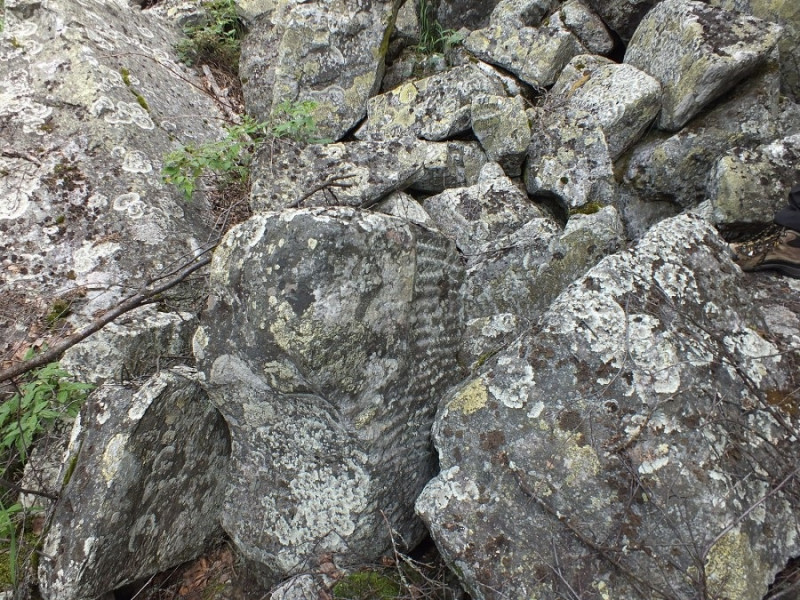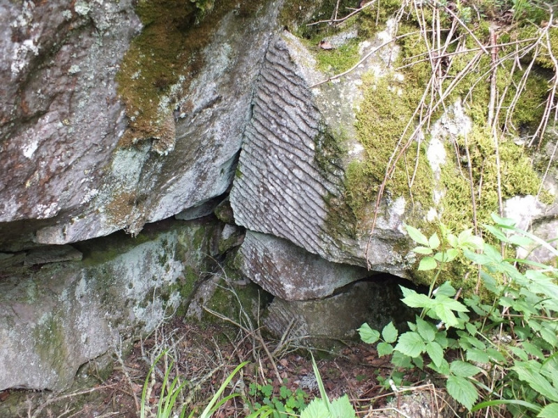 Отдельная тема, это наличие камней с ребристой поверхностью, которая напоминает стиральную доску недалёкого прошлого. Высказывалось предположение, что это могут быть следы оплавления камня высокой температурой во время взрыва. Но мы внимательно осмотрели обнаруженные образцы, поверхность не имеет следов плавления и соответствуют поверхности раскола. При этом совершенно непонятно при каких условиях гранит при раскалывании будет образовывать подобную структуру, но есть большие сомнения, что это следствие раскалывания из-за естественной эрозии под воздействием воды и перепада температур. Камней с такой поверхностью встречается достаточно много. Мы не ставили перед собой целью специально их искать, просто шли по маршруту, но даже при этом видели их больше десятка. Находили мы подобные камни и на склоне горы Иремель.
