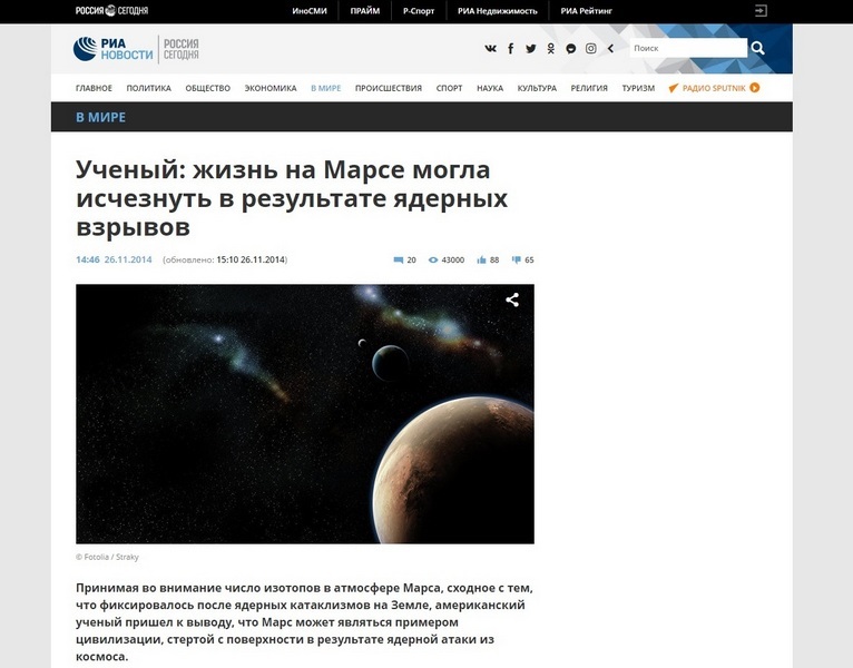 «Принимая во внимание число изотопов в атмосфере Марса, сходное с теми, что фиксировались после ядерных катаклизмов на Земле, Марс может являться примером цивилизации, стертой с поверхности в результате ядерной атаки из космоса», — говорится в исследовании Бранденбурга.»
