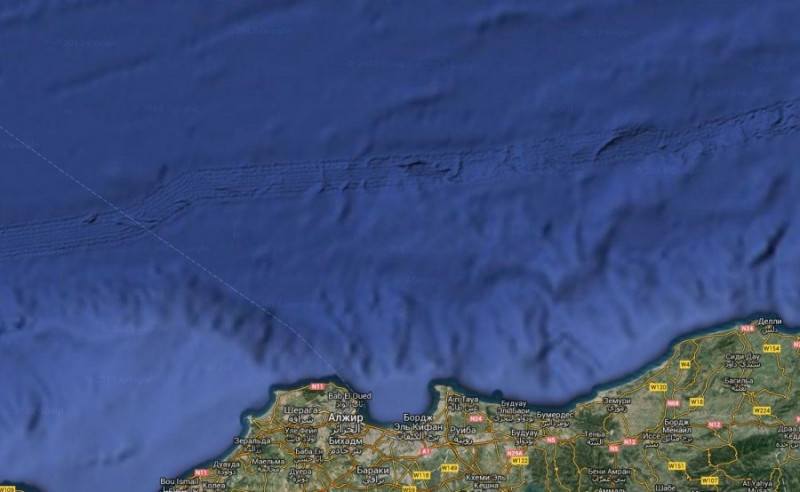 Ширина данных полос около 6 км, ширина одной полосы около 660 метров. При этом в некоторых местах, где деформировано дно, вместе с ним деформированы и данные «борозды», их структура нарушена. От пролива Гибралтар на восток линии тянутся на расстояние около 1200 км, а на запад, по дну Атлантического океана, до острова Сан-Мигел на расстояние 1800 км. При этом в районе данного острова имеется целый узел из подобных образований, поскольку от него подобные структуры расходятся в несколько сторон. В промежутке между городами Аннаба и Эль-Кала возле северного побережья Африки следы объекта теряются, упираясь в возвышенность дна. Но если продолжить линию на восток, то через 660 км, когда возвышенность кончается, мы снова видим похожее образование, которое разделяется на два направления. Причём верхний объект делает два поворота под достаточно острыми углами. Вот как эти следы выглядят у побережья Алжира