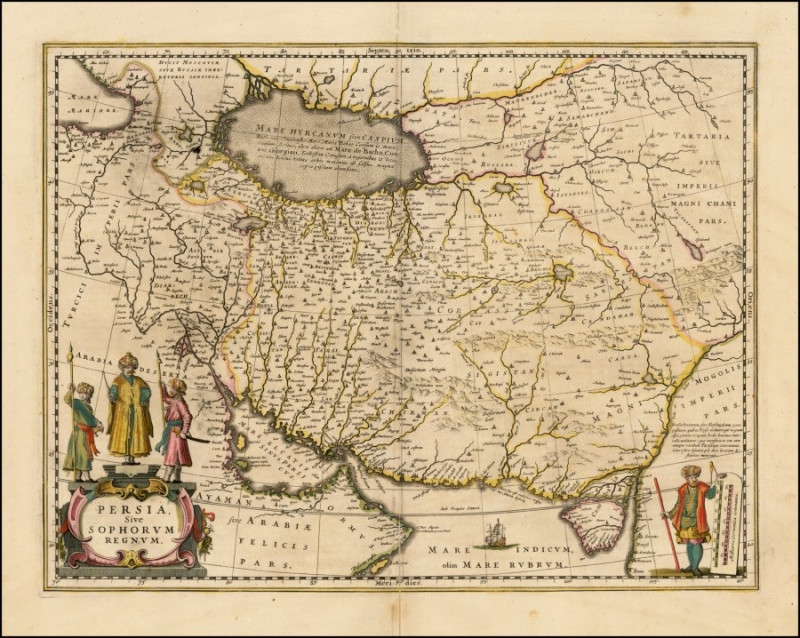 А вот этот фрагмент интересен тем, что сообщает нам о падении очень крупного метеорита в море. Правда, тут не совсем понятно, о каком море идёт речь. Возможно, что в данном случае имеется в виду большое внутреннее Каспийское море, которое можно найти на некоторых старых картах, от которого в итоге остались намного меньшее Каспийское море и Аральское море. На старых картах 16-18 веков это выглядит так. Конфигурация моря совсем другая, хотя это можно попытаться списать на умение картографа. Но на карте отчётливо прорисованы крупные реки, которые впадают в Каспий на восточном и южном берегу. Сейчас этих рек не наблюдается.