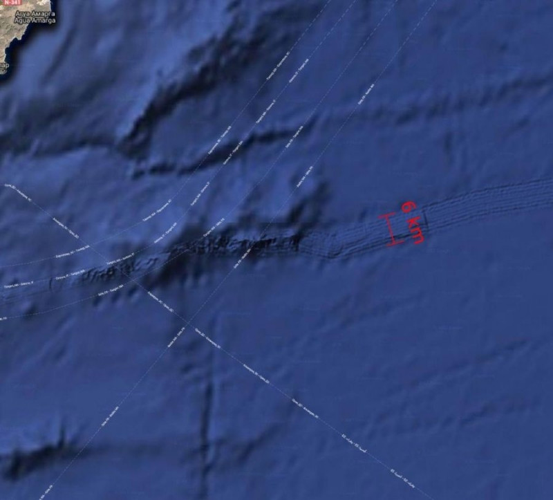 Причём в Атлантическом океане структура объекта меняется. Там уже скорее одна полоса на каком-то основании. Но ширина основания составляет всё те же 6 км, а ширина самой полосы около 660 метров.