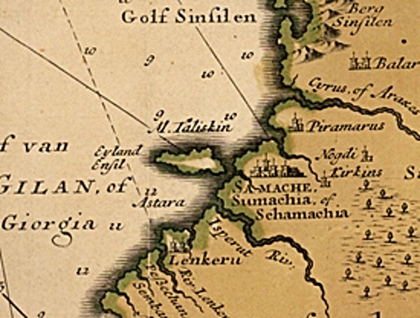 Получается, что город Шамахия существовал в действительности, причём сравнительно недавно, раз о нём писал Пушкин, который узнал о нём из рассказов своей няни Арины Родионовны. Вот только сейчас вы его на карте не найдёте. Как не найдёте и других городов, расположенных дальше по побережью: Kesker, Farabath/Ferebath, Esterabad/Aftrabath и т. д.