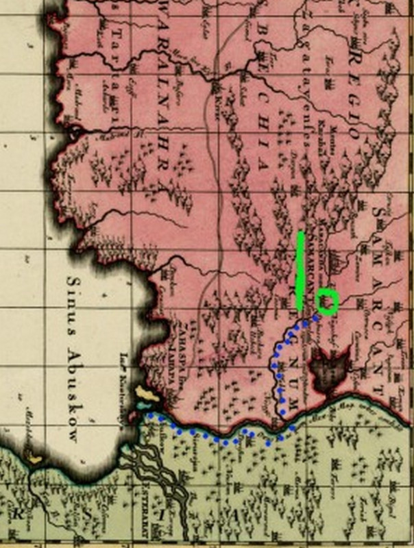 Мы в который уже раз видим множество рек по южному и восточному берегу Каспия, которые сегодня отсутствуют. Но на этой карте также показано, что город Самарканд (обозначен зелёным кружком, подпись подчёркнута зелёной линией) стоит на реке, по которой мы можем попасть в Каспийское море! Этот путь я пометил синим пунктиром. Река, на которой стоит Самарканд, впадает в крупную реку, которая на одной из карт обозначена как Kajak, и которую мы можем наблюдать практически на всех рассмотренных ранее картах, то есть, это не ошибка составителей, такая река в действительности была в те времена.