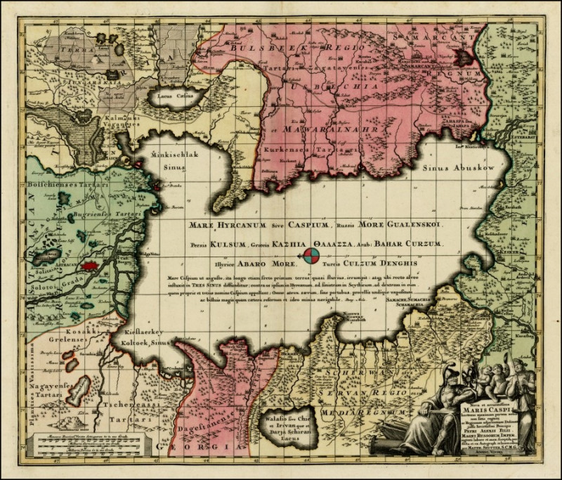 На этой карте подписаны большинство рек и обозначено множество городов. Но при этом города и реки, которые расположены на западном и северном берегах, находятся легко, а вот те, что расположены на южном и восточном, нет. Каким образом получилось, что в одной части топонимы сохранились до наших дней, а в другой полностью изменились? Что по этому поводу нам может сообщить официальный исторический миф? И куда исчезли острова в верхней части Каспия? Они не только тщательно прорисованы, но даже обозначена их принадлежность разным государствам. Для мореходной карты подобные вольности в изображении несуществующих островов недопустимы. Кстати, на этой карте обозначен город Schamachia, который по-русски будет звучать как Шамахия, что подтверждает её подлинность.