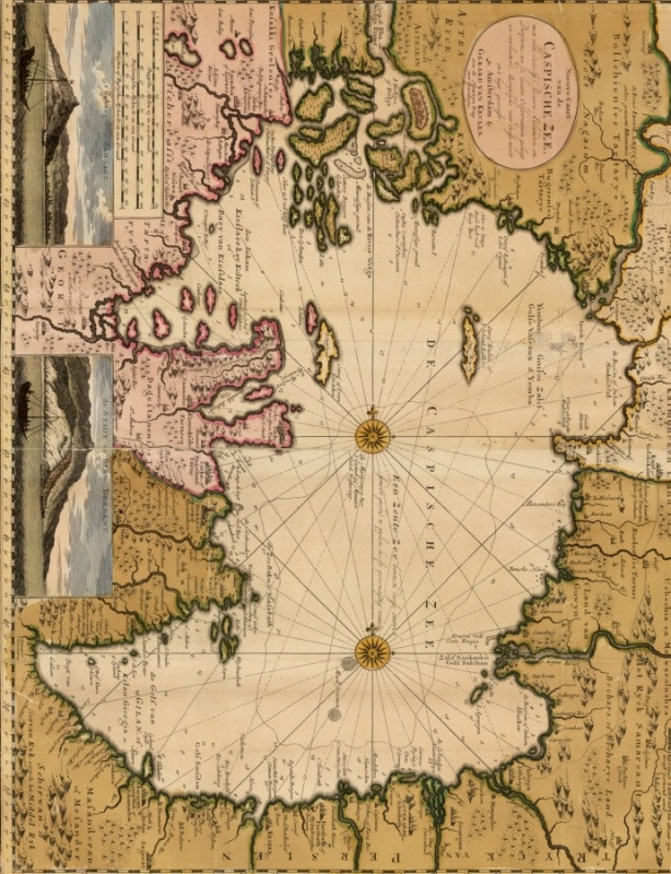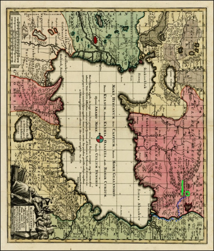 Следующая карта вообще уникальна, поскольку это карта именно Каспийского моря, причём карта мореходная, поскольку на ней обозначены промеры глубины, а также даны вставки по заливам и устьям крупных рек. При этом реки Krudosel, я найти не смог.