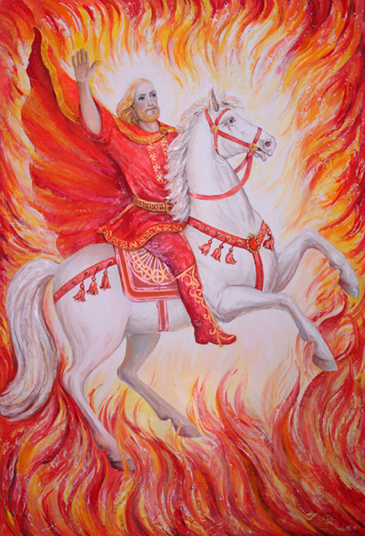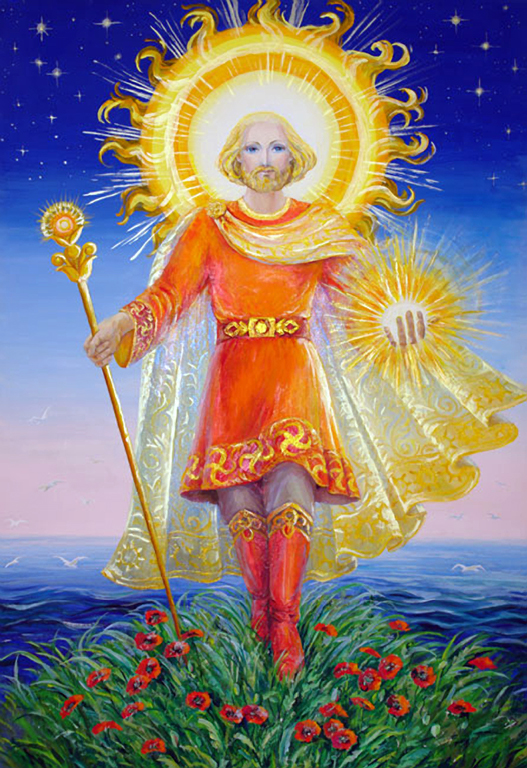 РОДОСЛОВНАЯ: Согласно преданиям, после того, как Сварог ударил магическим молотом о камень Алатырь, высеклись искры, из разгоревшегося пламени которых предстал огненный бог Семаргл. В день Осеннего равноденствия Семаргл откликается на зов Купальницы, призывающей на любовные игры. А спустя девять месяцев, в день Летнего солнцестояния, у богов рождаются дети – Кострома и Купало.