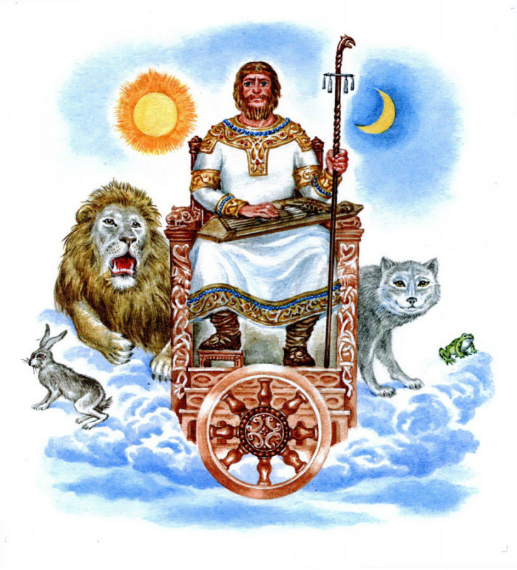 РОДОСЛОВНАЯ: Даждьбог сын великого Перуна и нежной русалки Роси, он — прародитель народа русского. Через отца — внук Сварога, через мать — внук Велеса. Супруг Златогорки, Живы и Марены.