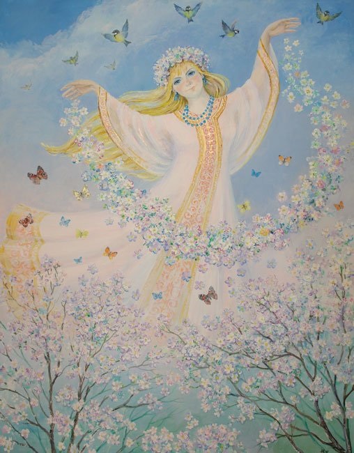 Жива властвует, когда зеленеют, расцветают поля и леса, сады и огороды, когда люди, очнувшись от унылого зимнего сна, словно впервые видят красоту весенней природы, красоту расцветающей молодости, впервые познают прелесть любви и нежности.