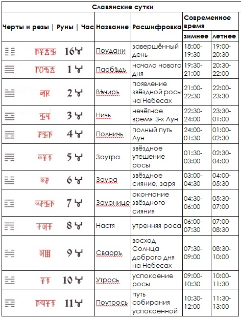 Десятый час -УТРОСЬ — Успокоение Росы. Стоят руны – Утеха и Рось. Времяс 9.00 – 10.30 – з.вр, 10.00 – 11.30 – л.вр.