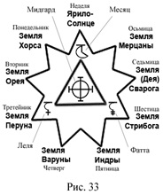 Треугольник внутри звезды на рис.39означает три луны – Месяц ( вверху), Леля ( слева)и Фатта (справа)В центре треугольника – Мидгард – Земля ( не разобрать нарисованного знака – прим. Расы).