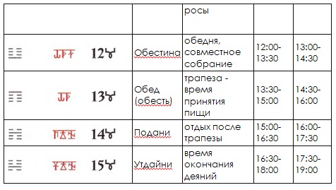 Тринадцатый час – ОБЕСТЬ — ОБЕДЪ – Трапеза – время принятия пищи.Время 13.30 – 15.00 – звр, 14.30 – 16.00 – лвр.
