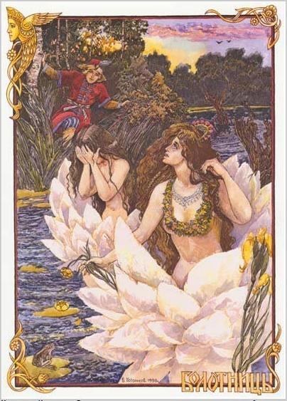 ..БОЛОТНИЦА — болотный дух, дева-утопленница, на болоте живущая, жена Болотника, Её чёрные блестящие волосы раскинуты по открытым плечам и убраны они осокой да незабудками. Растрёпанная и вечно нечёсанная, бледнолицая, с глазами, как бутылочное стекло, всегда нагая, она готова заманивать людей к себе только лишь для того, чтобы защекотать до смерти без всякой особой их на то вины и потопить их в трясине бездонной.
