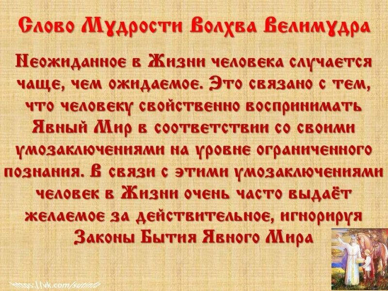 И поведано вам, чада, буде Слово сие, Слово вельми Мудрое, Слово Древнее. Сие Слово не то, что во мгле почило, а то, что сама Матерь-Жизнь сложила и Волхва именем Велимудр одарила. Слово Мудрости сие, сиречь Весть, его для добрых людей всю жизнь несть. Внемлите зову, чада, Весть познавати, не то, что через топи торить гати. Сию Весть надобно и умом воспринимати и сердцем своим принимати, а пуще всего в каждый образ Слово Мудрого вникати.