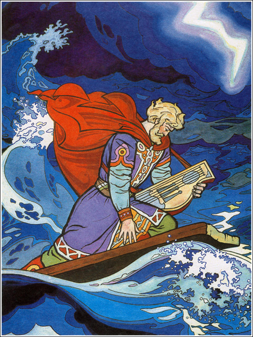 Оставшись в море, Садко вскоре заснул и проснулся, когда уже очутился на самом дне. В белокаменном дворце герой встречает морского царя, и тот просит его сыграть на гуслях. Только начал Садко играть, начал морской царь плясать. Гусляр три дня играет – три дня морской царь пляшет. А в это время на море началась страшная буря – много кораблей разбилось и людей погибло.