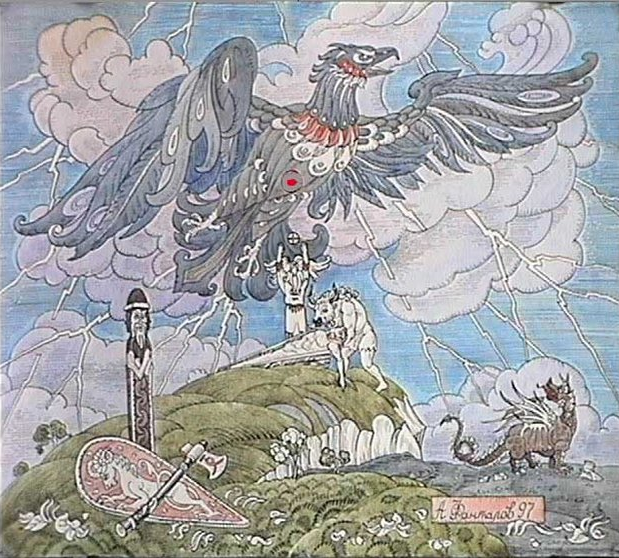 Здесь изображен славянский вариант мифа о воскрешении Героя, который был убит драконом. Рядом мы видим Велеса, который как Бог Земных Сил родствен образу Героя. Орел является символом Бога Грома.