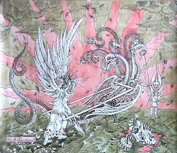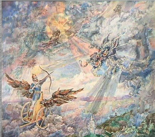 Сварог (здесь изображенный согласно концепции Б. Рыбакова как многоглавые боги западных славян или индийский Брахма) и сын его Даждьбог — «Царь-солнце», победив в начале мира Черного змея, вспахивают на нем землю. (А. Фанталов, 1996).