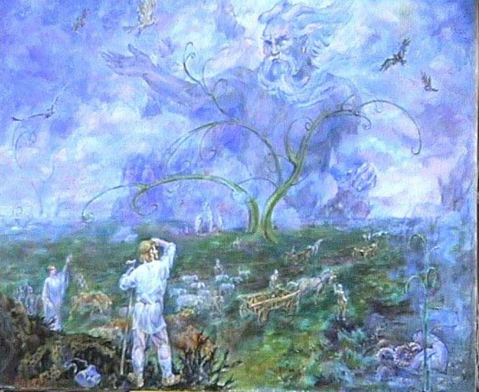 Картина в легендарном свете показывает расселение славян На ближнем плане — Микула Селянинович, мифологический герой-земледелец. Вдали — древний великан Святогор, уступающий мир людям.