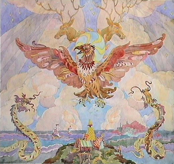 Буян есть легендарный остров русского фольклора. На этой акварели мы видим структуру мира в славянской мифологии. Олени воплощают порождающее начало (верхний уровень мироздания). Орел есть олицетворение грома (средний уровень). Змеи представляют подземны мир. Все три уровня бытия связяны облачным мировым древом, расположенном корнями вверх.