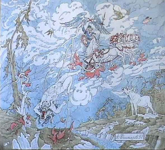 Победив чудищ, светлые боги — Сварог, Даждьбог, Перун, Лада и другие укрылись в ладье. которую и привел к очищенной земле прародитель Род в образе исполинской щуки (как Вишну привел корабль Ману — индийская мифология).