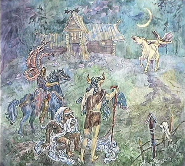 Эта картина показывает славянских хтонических персонажей: Велеса, Усыню (мужик, сам с перст — усы на семь верст), Горыню (всадник, оплетенный змеями) и Бабу Ягу, подобную здесь валькирии скандинавской мифологии. Велес есть славянский Бог Земных Сил, остальные персонажи — герои славянских сказок.