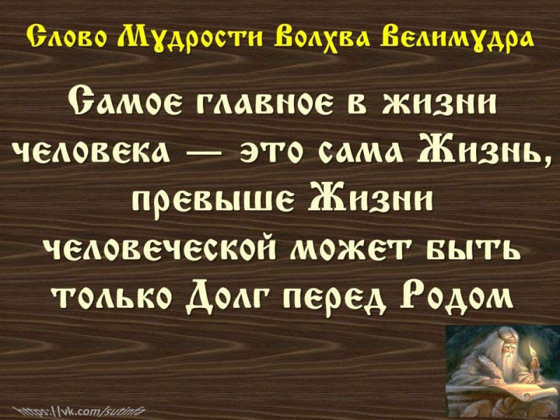 «Всё. Самое главное в жизни человека это сама жизнь. Не партия, не правительство, никто! Жизнь самое главное в человеке. Самый главный приоритет. Превыше жизни может быть только долг перед Родом. А долг перед Родом это продолжение Рода, потомство, это защита земли, защита Веры, защита Отечества. Всё. Вот это всё может быть превыше жизни. Поэтому наши Предки сражались не щадя живота своего. Т.е. защита это превыше всего»