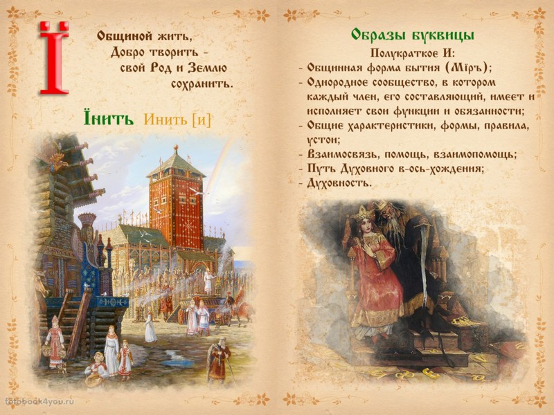I ї — Инить (и). С двумя точками наверху, что указывает на ограниченность пространства: гармония наша истинна, утвержденная и сотворенная, т.е. уже приведенная в определенный порядок. Слово наша (а не мое, не её), т е общее, множественное. Т о Инить передает образ единого много-сферного (общинного) определения: общие характеристики, формы, правила, устои. Слово «Мїръ» (мудрость в принятии единого решения) в данном случаи характеризовало именно общинные формы бытия наших предков, которые испокон жили общиной, миром. И что это так, подтверждают до сих пор сохранившиеся словообразы: «мїрянє». Устоявшийся в исторической науке термин «первобытно-общинный строй» есть не примитивное, стадное существование дикарей в грязных шкурах, а изначальное бытие структуры мира, т.е. общины. Буквица «инить» не имеет числового обозначения, т.к. характеризует общинную (множественную) форму.