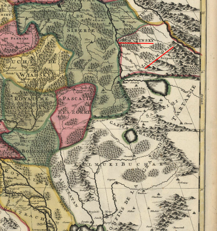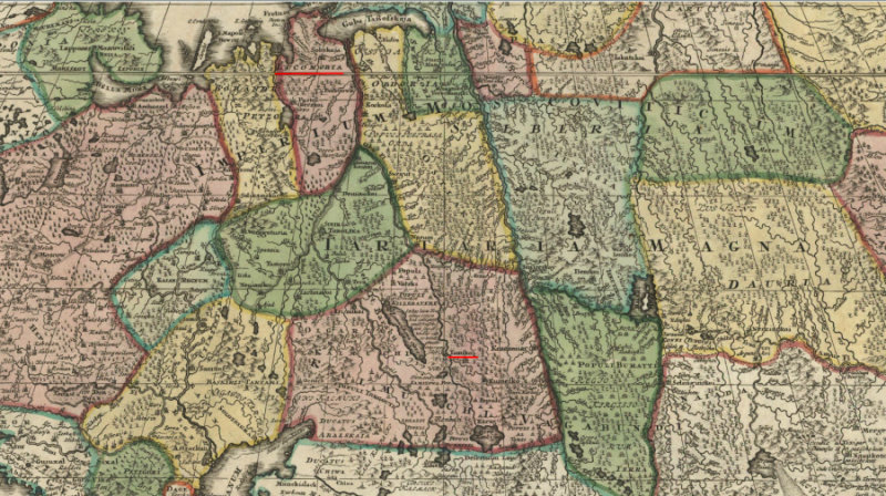 Здесь наконец Грустина стала городом Томской, Лукоморье переехало на север а ниже Империи Московской обозначена Большая Тартария.