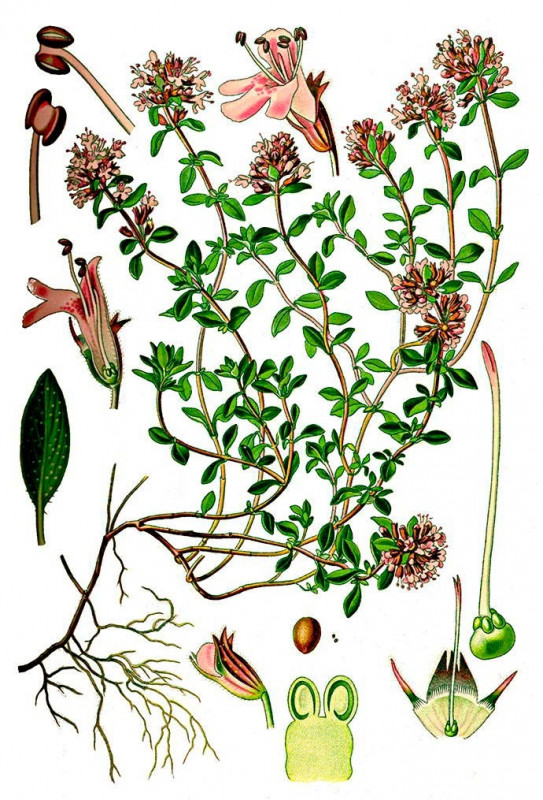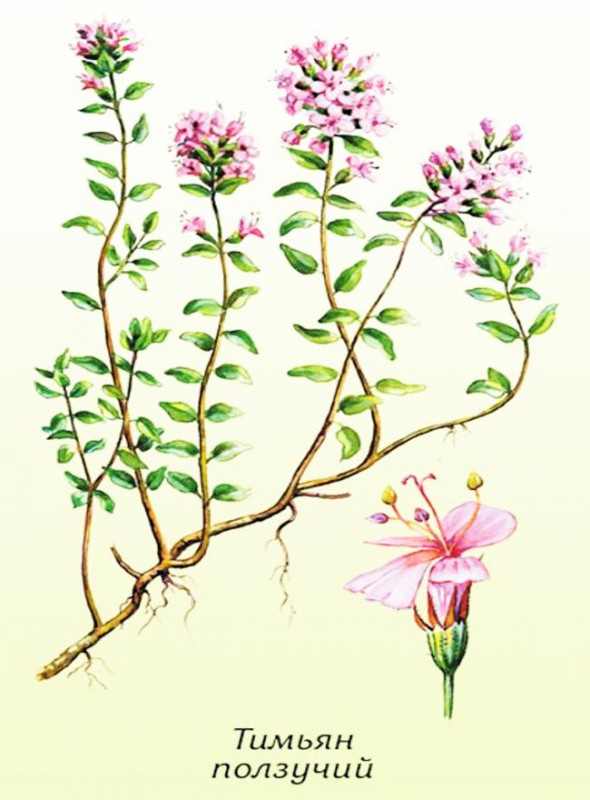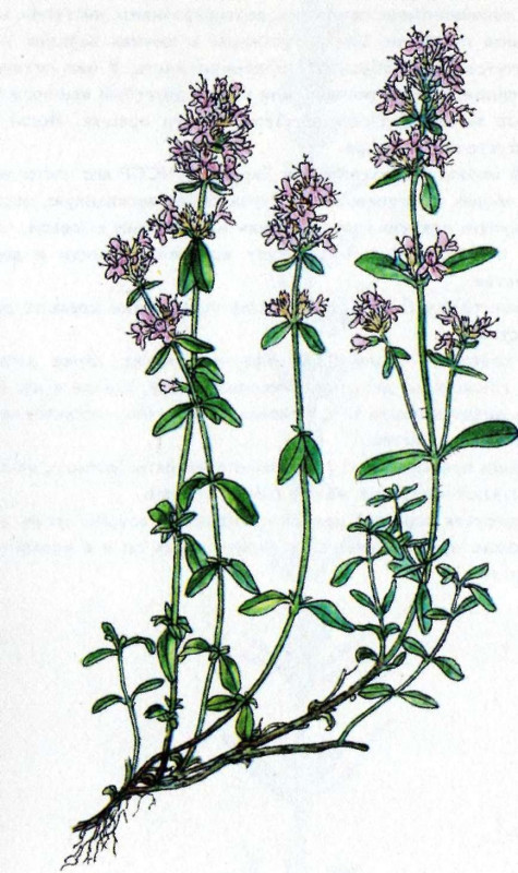 Высокие лечебные свойства чабреца определены уникальностью химического состава. Эфирное масло растения содержит тимол, борнеол, карвакрол, а-терпинеол, n-цимол: