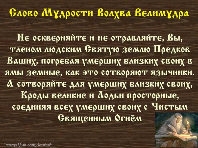 «Здесь касаемо погребального. Т.е. тело в земле подверженно тлению, разложению, а значит выделяется трупный яд, который с грунтовыми водами может попасть в здоровую почву, в водоем, в пищу и может осквернить и землю, и человека отравить. Поэтому – погребальные костры — кроды и лодьи. А в ямы земные – это сотворяют язычники т.е. другие народы. Но у них некуда. Почему многие захоранивали в землю? Допустим, Ближний Восток. Там песок. Там сухо, в песок зарыли, влага вся истекла, и там тело высохло как мумия. И всё, испарилось. А у нас же климат другой, особенно, когда живут рядом с болотом и пр. т.е. чтобы гниения не было, чтобы оно не отравляло землю, воду, надо сжигать.