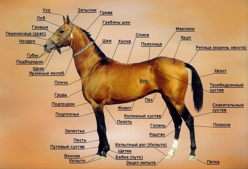Лошадь обладает довольно необычным строением, которое помогает ей быть выносливой и преодолевать большие расстояния с большой скоростью. Длина головы животного составляет примерно 2/5 от общей высоты животного. Череп вытянутый, на конце находятся ноздри и рот. Под губами скрываются мощные челюсти. У лошади от 36 до 40 зубов. Глаза у животного большие, на веках растут длинные ресницы. Наверху находятся уши, которые могут поворачиваться на источник шума. Голова держится на массивной шее, наверху которой растет длинная грива. Лошадь обладает массивным и мускулистым телом, способным выдерживать высокие нагрузки. От холки до крестца, вдоль спины, у животного проходит широкая спинопоясничная линия. Задняя часть лошади наклонная. Спина имеет слегка вогнутую форму. Живот выпуклый. Конечности лошади устроены таким образом, что центр тяжести приходится на передние. На их конце находятся копыта.