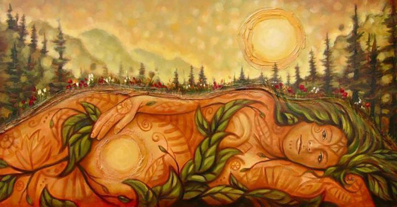 Плодотворная сила солнечных лучей и дождевых ливней, ниспадающих с небесного свода, возбуждает производительность земли, и она, согретая и увлажненная, растит травы, цветы, деревья и дает пищу человеку и животным. Это естественное и для всех наглядное явление послужило источником древнейшего мифа о брачном союзе Неба и Земли, причем Небу придана воздействующая, мужская роль, а Земле — воспринимающая, женская. Летнее Небо обнимает Землю в своих горячих объятиях, как невесту или супругу, рассыпает на нее сокровища своих лучей и вод, и Земля становится чреватою и несет плод: не согретая весенним теплом, не напоенная дождями, она не в силах ничего произвести. В зимнюю пору она каменеет от стужи и делается неплодною; с приходом же весны Земля, по народному выражению, «принимается за свой род».