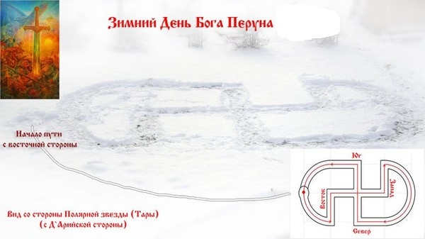С той поры, люди стали отмечать «Зимний День Перуна», как праздник победы над злом… и проходят 9 кругов по свастичному лабиринту, который называется — Перунов Путь.