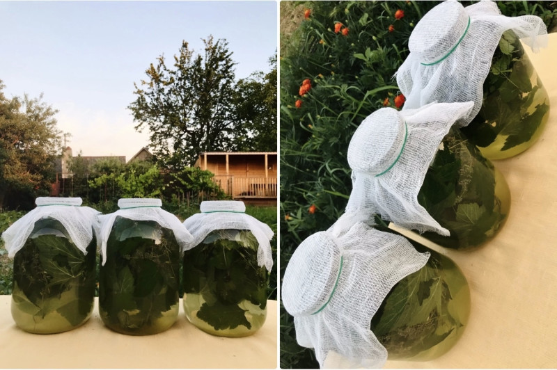 Травы лучше завязать в марлю с камешком из реки и опустить на дно банки, чтобы травы не окислялись на границе вода — воздух. Камень, прежде чем использовать, надо промыть и прокипятить в кипящей воде.