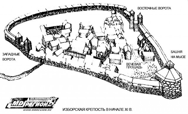 Все данные раскопочных исследований красноречивы, Изборск в первый период своей истории не был рядовым поселением. Это крупный торговый город. А где богатства, там и разбой. Изборск уже в V-VII веках был очень хорошо защищен. В результате раскопок проявляется планировка и застройка раннего Изборска. По площади он занимал около 6 тысяч кв. м. С момента основания Изборск был укреплен двумя дугообразными валами, сложенными из очень плотной глины и камня. Защищался город с напольной стороны, и небольшим в мысовой части. Позже мысовую часть с сохранившейся вечевой площадью занял детинец, обнесенный по периметру бревенчатой стеной. Детинец имел въездные ворота, вероятно укрепленных башней.