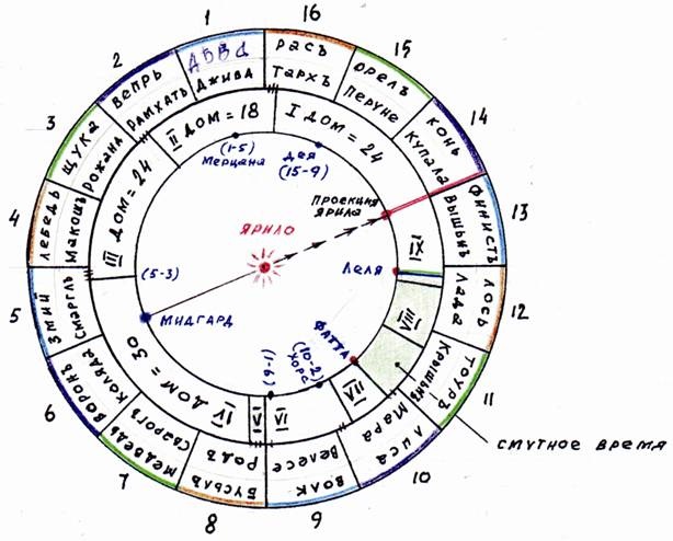 Надо не только вычислить, но и проставить на космограмме: Фатту и Лелю. Кроме того, Фатта у нас где? Седьмой. А Леля — первый. И заметьте, что я делаю? Заштриховываю. Но в этом Смутном времени у нас уже есть какая-то Земля. Т.е. в теневой, в негативе, как бы.
