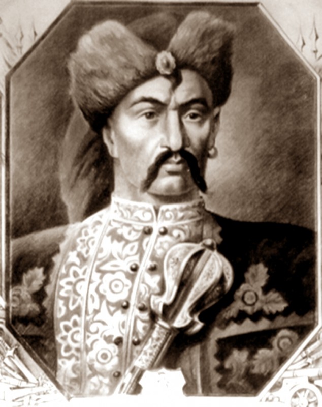 Запорожский казачий полковник Иван Богун (1618 — 1664) с полковничьим шестопером за поясом.