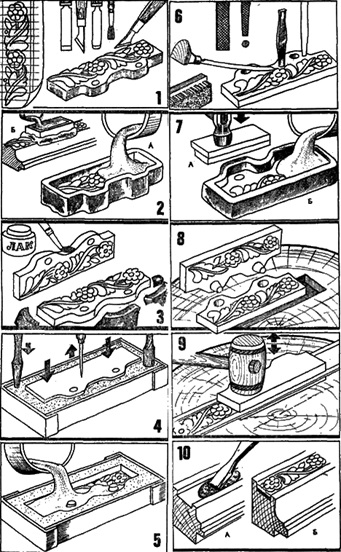Если же в качестве модели использовать уже готовый рельеф, то изготовление басмы доступно даже тем, кто не имеет навыков в рисования и нe знаком с резьбой по дереву. Предположим, что нужно изготовить басменный рельеф для рамки. За основу можно взять любой отрезок багета с рельефным узором. Прежде всего, точно определите границы раппорта, то есть повторяющейся части узора. Руководствуясь ими, склейте из картона узкую рамку и прикрепите её к багету с помощью пластилина. Участок рельефа, включённого в рамку, а также её внутренние стенки, смажьте вазелином с помощью кисти. Вазелин будет служить разделительным слоем, не дающим залитому в опалубку гипсу прилипать к стенкам и рельефу. Разведите в гипсовке 9 частей гипса в 7 частях воды. Вместо формовочного гипса можно использовать строительный (алебастр). Гипсовку легко сделать из старого резинового мяча. Мяч разрезают пополам, а затем укрепляют на подставке. Резиновая гипсовка удобна тем, что после работы из нее легко удаляется засохший гипс: достаточно лёгкого нажима на гибкие стенки. Гипсовый раствор, имеющий консистенцию сметаны, залейте в опалубку из картона. Примерно через 20-30 мин, когда гипс, затвердеет окончательно, снимите с багета пластилин и опалубку. Осторожно отделите гипсовую модель матрицы от рельефа. Вырезав сбоку два конических отверстия для направляющих штырей, высушите гипсовую модель. Чтобы она не впитывала влагу, покройте её несколько раз масляным лаком или эпоксидным клеем, который продается в хозяйственных магазинах. Прежде чем пользоваться эпоксидным клеем, внимательно прочтите инструкцию, вложенную в коробку, и при работе с ним не забывайте соблюдать все необходимые меры предосторожности. Каждый последующий слой лака или клея наносится только после полного высыхания предыдущего. Загустевший лак разводят до рабочего состояния растворителями, а эпоксидный клей —ацетоном. Готовая к отливке гипсовая модель матрицы должна иметь лёгкий глянцеватый блеск.