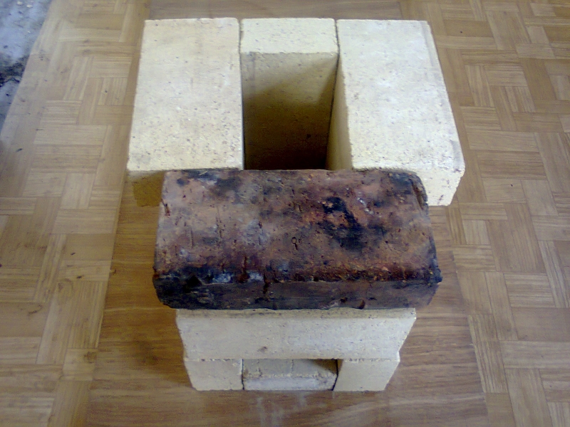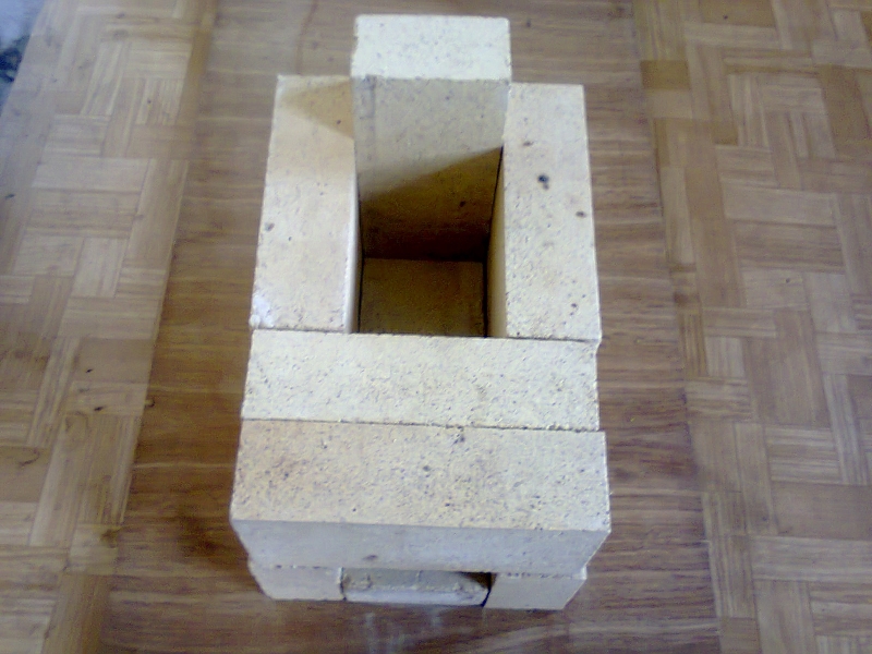 Топка выложена из десяти целых и трёх половинок огнеупорного кирпича, его размеры чуть меньше, чем у обычного, это следует учитывать. Для сокращения длины топки, как было рекомендовано в вышеприведённой книге, пришлось распилить два кирпича пополам.