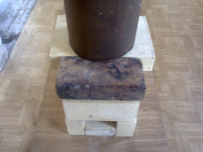 Далее по бокам ставятся два продольных кирпича и один поперечный на дно камеры сгорания. Выкладываются ещё три кирпича, формирующие ровную площадку для установки вертикальной трубы дожига высотой 63-125 см. Её можно выложить из кирпича или поставить готовую металлическую. Я воспользовался вторым вариантом, благо, что был в запасе кусок 200 мм трубы с толщиной стенки 8 мм.