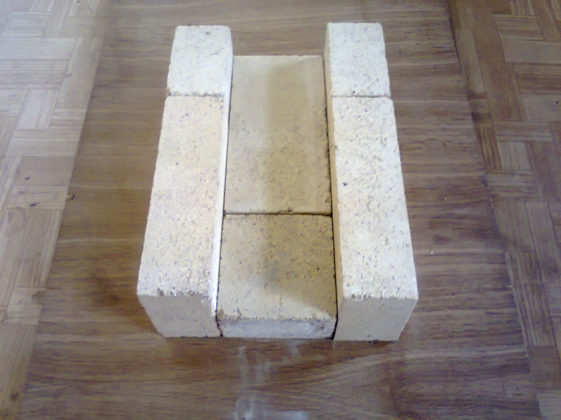 На дно короба плашмя и впритык друг за другом вдоль положены кирпич и половинка второго – это дно камеры сгорания (топки). Вдоль них по бокам поставлены на длинную грань ещё две таких же пары, но так, чтобы стыки не совпадали.