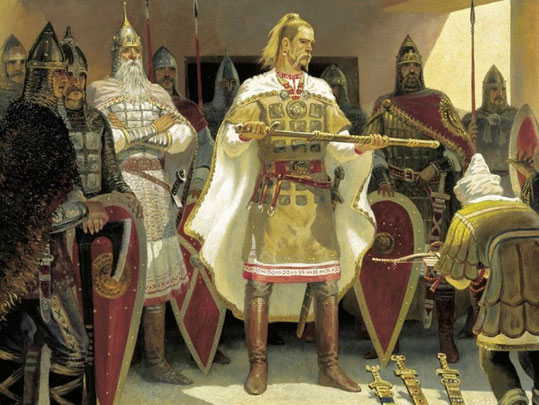 Предками казаков является военное сословие варягов-русов. Прежде чем начать разговор о происхождении казаков, вспомним образ князя Святослава, описанный в хрониках. Облик князя имел три отличительные черты: висячие усы на бритом лице, обритая голова с прядью длинных волос и серьга в ухе. Что-то в облике князя напоминает нам запорожских казаков, не так ли. Интересно, из каких источников запорожцы подцепили эту древнюю моду? И кто такие запорожские казаки? Чтобы объяснить это, стоит обратиться к истории средних веков, к периоду Новгородского княжества и до начала становлению Москвы, как зародыша централизованного государства. Известно, что корни государственности Руси начинаются где-то в конце IX века и связаны по времени с появлением на славянской земле варяга-руса Рюрика с братией и обозом. Прибывшие варяги, совпадающие по внешности с обликом Святослава, пришли не одной дружиной, а со всем скарбом, женами и детьми и поселились в Старой Ладоге, затем в Великом Новгороде и далее по всем городкам и крепостицам вдоль великого водного пути « из варяг в греки». Путь этот брал начало с устья реки Волхов, а не откуда-то из неизвестного «варяжского» государства и заканчивался в Черном море, где на северном берегу проживали те самые «греки», впрочем, самые настоящие греки, колонизировавшие этот край. Долгое время русы-варяги, давшие название нашему государству, ассимилировалось с местным населением весьма неохотно, представляя собой монопольное воинское сословие. Следует заметить, что дружины этого субэтноса на территории Руси предпочитали зарабатывать на хлеб и мед исключительно оказанием воинских и охранных слуг, не уступая этого права никому. При этом нелишним будет упомянуть, что варяги-русы в немалом числе служили в охране императоров византийских, что не мешало Святославу вести войны с Константинополем. Летописи утверждают, что после смерти Рюрика главным городом Руси стал Киев, куда перебрался князь Олег Вещий с воспитанником Игорем, сыном князя Рюрика. Русы-варяги долгое время составляли костяк войска русского, пока Ярослав Мудрый не решил объединить на Руси все племена и народы под своей десницей и под единой верой, естественно, в этом процессе не могла не появиться новая, разношерстная аристократия, с которой русы-варяги вряд ли смогли ужиться. Видимо, с этих соображений князь Ярослав Мудрый отправил морем большое войско к стенам Константинополя, состоящее в основном из русов-варягов. Как известно, поход этот закончился неудачей по причине шторма и неразумности походного вождя княжича Владимира. Флот русский был потоплен, оказавшиеся на суше воины попали в окружение, а затем и в плен по договоренности княжича Владимира и византийского императора. Наверное, княжич, таким образом, намеревался сберечь жизни своих воинов, но получилось все крайне плохо. Император Константин, действительно, не предал смерти ни одного из пленников, он просто ослепил 6 тысяч воинов и отправил их домой. Явил, так сказать, милость. Такая потеря личного состава варяжских дружин была трудно восполнима. После смерти Ярослава Русь быстро распалась на удельные княжества, а варяги, смотрящие за торговым водным путем, оказались не у дел, кто-то перешел на службу к местным князьям, а многие, собрав вещички, ушли в степи, на Дон и Кубань, приднепровские зе