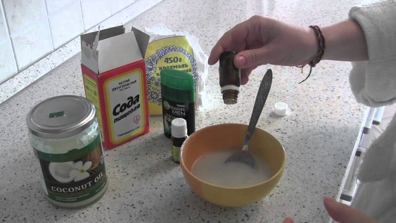 Отмеряем и смешиваем соду и крахмал. Сода давно используется для предотвращения появления неприятного запаха пота, часто можно встретить действенные народные советы борьбы с чрезмерной потливостью – обрабатывать подмышечные впадины содой, немного смоченной водой. Сода создает щелочную среду, в которой невозможна жизнедеятельность бактерий, вызывающих появление запаха пота.