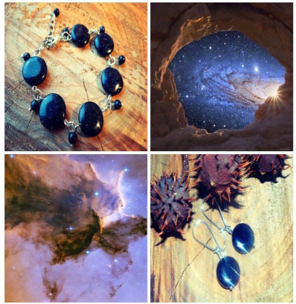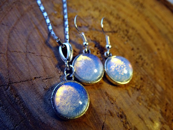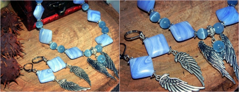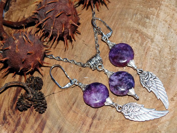 Серьги и кулон из невероятно красивого, напоминающего космическую галактику, кунзита (кунцита). А крылышки — те самые, которые помогли Персею преодолеть все трудности, чтоб воссоединиться со своей прекрасной возлюбленной…