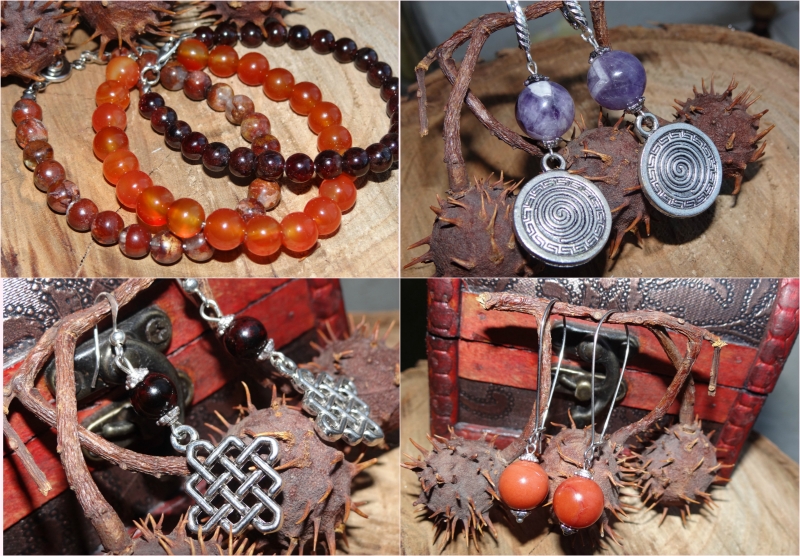 Серия браслетов в осенних цветах из фантомного кварца, сердолика и граната.