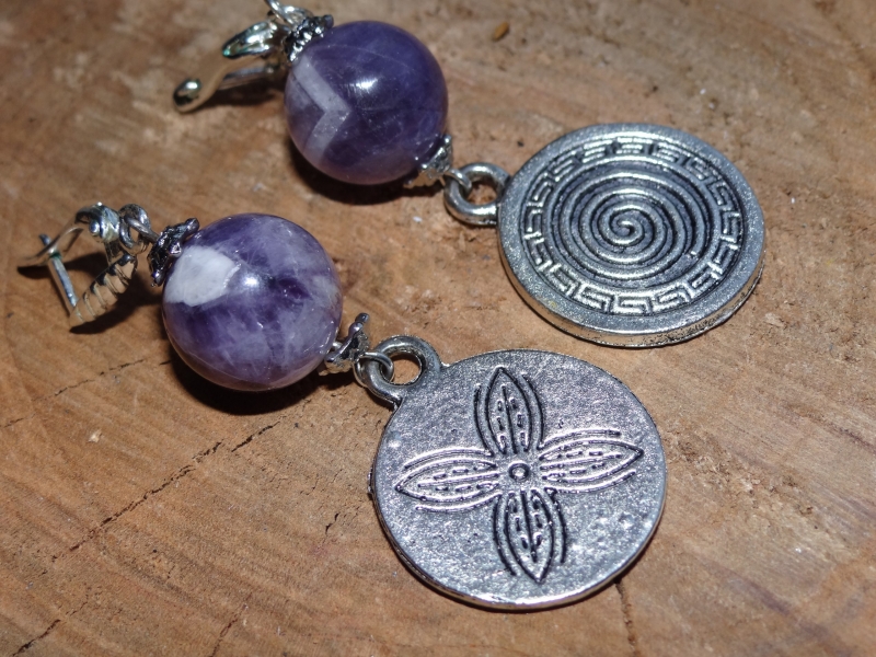 Серьги из аметиста с символом лабирината (на обратной стороне клевер). Лабиринт означает поиск и нахождение своего истинннного пути. Клевер — удача, везение