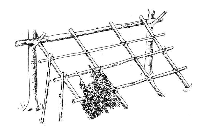 Временный балаган делается довольно просто — ведь это только половина обыкновенного шалаша. Забивают в землю два больших кола в рост человека или до плеч. В развилины на верхних концах укладывается поперечина, а от нее наклонно еще две или больше (сколько надо) жердей, которые станут основой крыши, стропилами. Параллельно земле на них укладывают длинные прожилины, крепя их либо кусками веревки, либо надранной ивовой корой. Сверху настилают лапник — широкие ветки ели или пихты. Естественно начинать настилать крышу надо от земли, снизу вверх так, чтобы каждый следующий слой веток перекрывал нижний не менее чем наполовину. Правда, все это ненадолго, потому что, высохнув, хвоя, конечно, осыплется. В Сибири такие балаганы, как я уже говорил, кроют, кроме того, лиственничным корьем или берестой. Береста лучше потому, что, во-первых, сама береза, отдав кору, свою верхнюю одежду, не погибнет, а будет жить, как жила. Во-вторых, береста материал достаточно долговечный и прослужит на крыше балагана несколько лет. Сверху настланную бересту или корье прижимали продольными жердями, чтобы ветер не разнес.